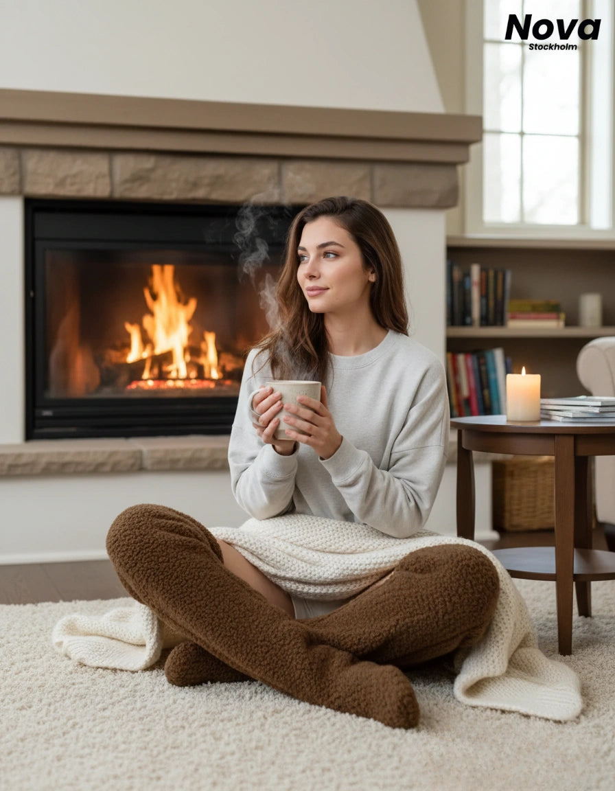 Dra på dig de lårhöga fleece-strumporna och känn hur värmen sprider sig från tårna, över knäna och upp längs låren – som ett mjukt, jämnt täcke runt hela benen.